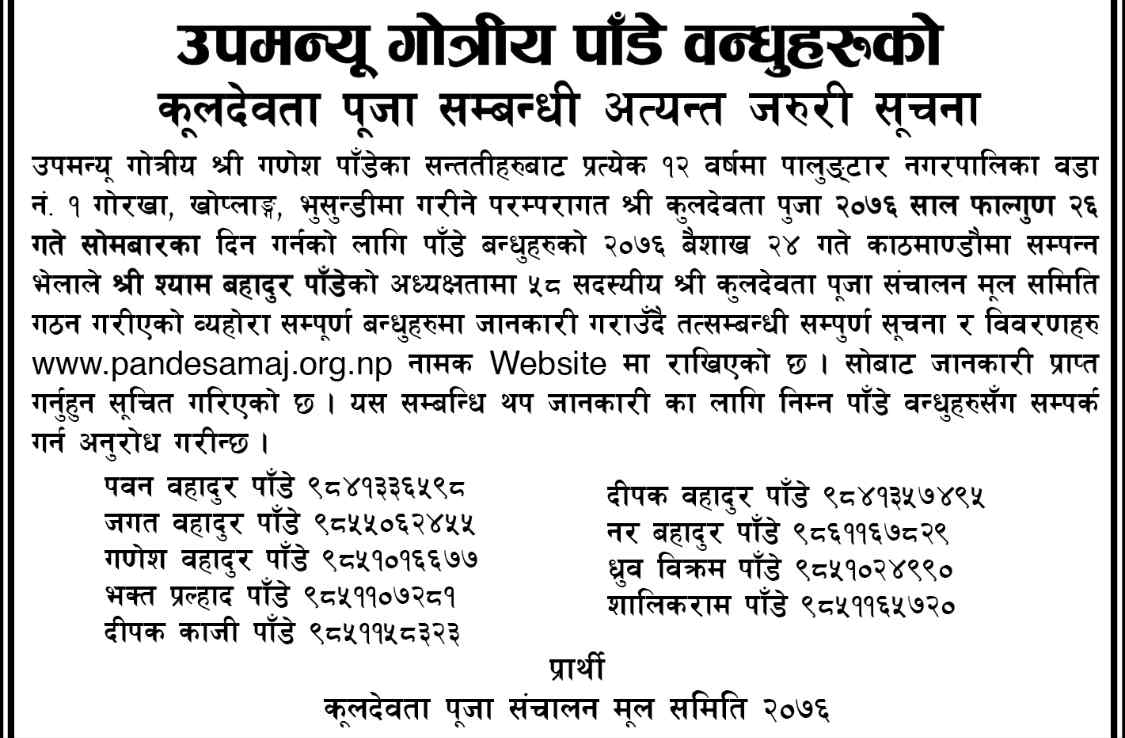 पाँडे सेवा समाजको विधान २०७६ वमोजिम गणेश पाँडेका सन्ततीहरु उपमन्यु गोत्रीय पाँडेहरुको कुलदेवताको पूजा २०७६।१२।२६ गते सोमबारका दिन नेपाल भर रहेका पाँडे वन्धुहरु हुन गईरहेको जानकारीका साथ पूजालाई मर्यादित , भव्य रुपमा सम्पन्न गर्नको लागि विभिन्न पेशामा आवद्ध पाँडे वन्धुहरु रहेको विविध समिति गठन गरिएको छ । जसको काम कर्तवय देहाए वमोजिम रहने छ ।